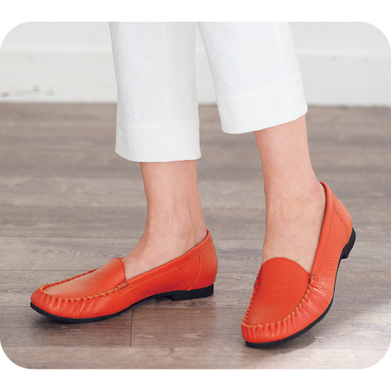 表面にシボ感のあるやわらかな牛革を使用。本革なのに軽量、中敷は全面クッションなので長時間歩いても疲れにくいのがポイントです。どんなコーデにもマッチするから、迷わず履けるのもうれしい!
