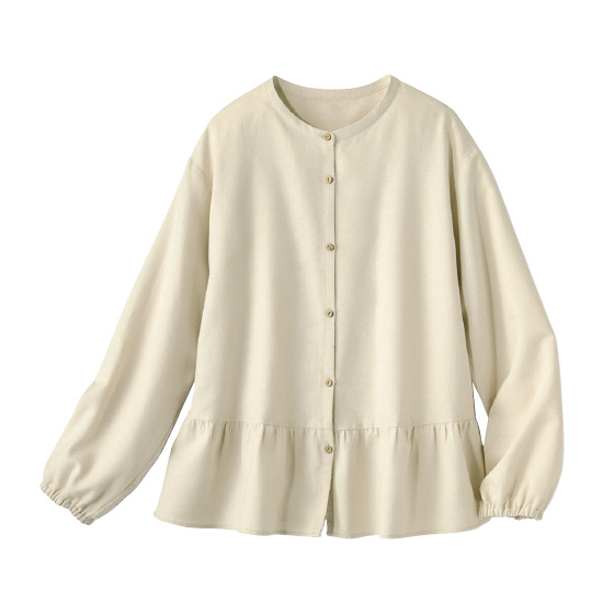 綿と麻をブレンドしたナチュラルな風合いの素材に微起毛加工をプラスしてやわらかな肌触りに。ペプラム切替のデザインだから、おなか回りもさりげなくカバー。