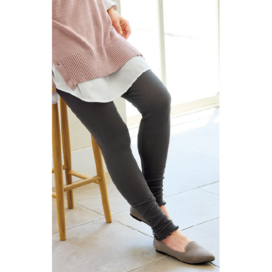 ふんわり軽く透け感のあるガーゼ調素材。おなかをすっぽり包む、深めの股上丈。裾は長め丈&フリル調メロウ仕上げ。