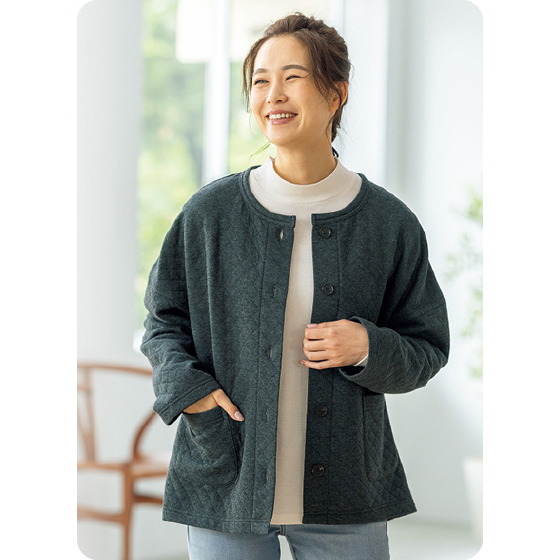 キルトの空気層に包まれてほっこり。洗濯機で洗えるのもうれしい。スマホもすっぽり大きめポケット。