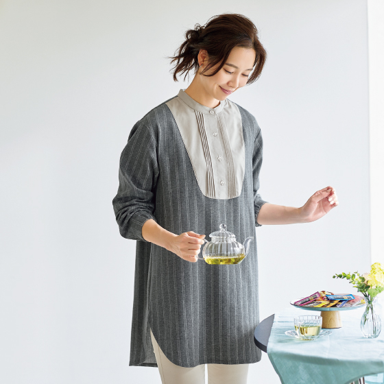 カットソー素材だからラクに着られて、胸元のシャツ生地使いでほどよいきちんと感。サッとかぶるだけでサマになり、ご近所へのお出かけもOK。