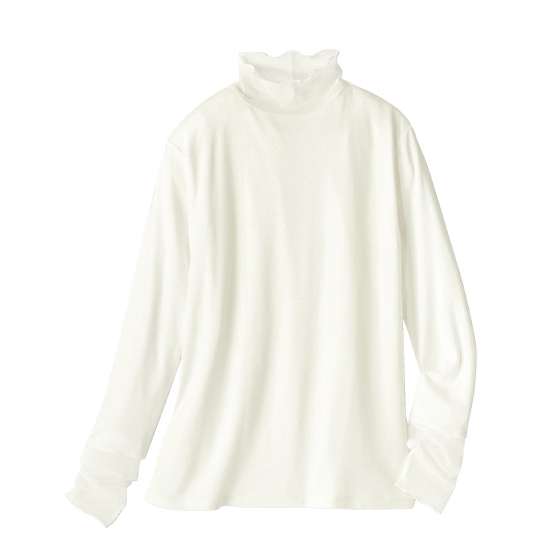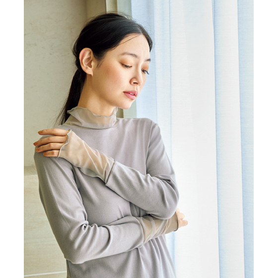 衿元と袖口がチュール、身生地は吸湿発熱素材で暖かな着心地。いつもの服と重ねるだけで新鮮な表情に。