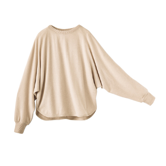ふんわり軽く、チクチクしにくい、ニット見えのカットソー素材。ドルマンスリーブでゆったり着られ、今どきの丈感でボトムス合わせも好バランスに。袖口リブ仕様で袖アップも簡単。