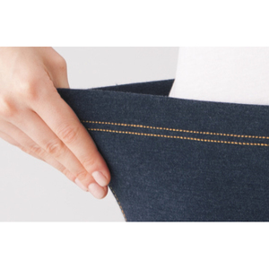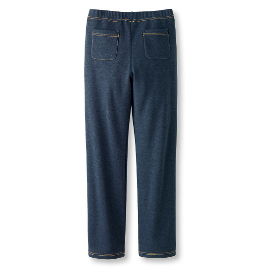 脚線を拾いにくいゆったりストレートで、さらにラクラクのはき心地。デニム調ネイビーにはジーンズ風のステッチ入り。