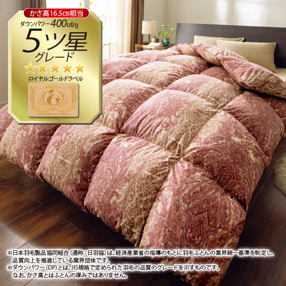 ●素材:側地=ポリエステル85%・綿15%、詰めもの=ダウン90%・フェザー10%、ダウンパワー(DP)400cm3/g相当(シングル=計1.1kg、シングルロング=計1.2kg、セミダブル=計1.3kg、ダブル=計1.48kg、クイーン=計1.65kg)、カバー=綿100%