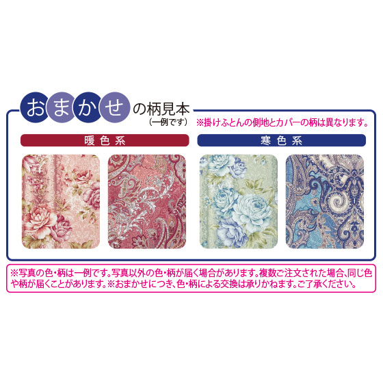 ※寝具商品は、生地幅の関係上ハギ(つぎ目)が入ることがございます。また裁断の都合により柄の出方が多少異なりますので、あらかじめご了承ください。※ふとん(特に敷きふとん)は使用状況によって、程度の差はありますが、必ずヘタリ(ボリューム感や弾力性がだんだんなくなる状態)が商品の特性上発生します。ご了承ください。