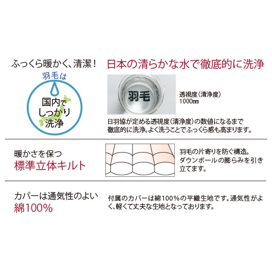 日羽協が定める透視度(清浄度)の数値になるまで徹底的に洗浄。よく洗うことでふっくら感も高まります。羽毛の片寄りを防ぐ構造。ダウンボールの膨らみを引き立てます。