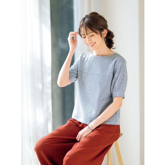 ポコポコとした表面感のある、ほどよい厚みのカットソー。胸の切替やふんわりタック袖がアクセント。