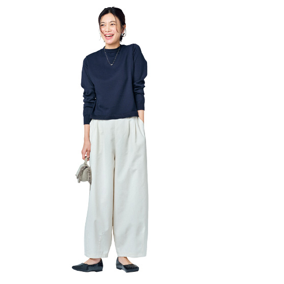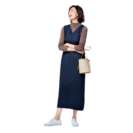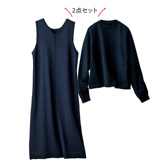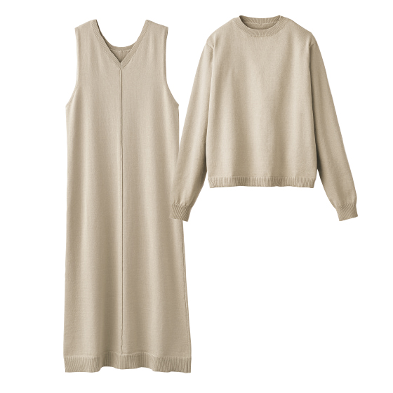 表側はつや感のある素材、肌側はコットンの春に心地よいワンピ&プルオーバー。体を締めつけず、体形も拾いにくくて着映え感があります。夏にはワンピ1枚でと長いシーズン活躍。