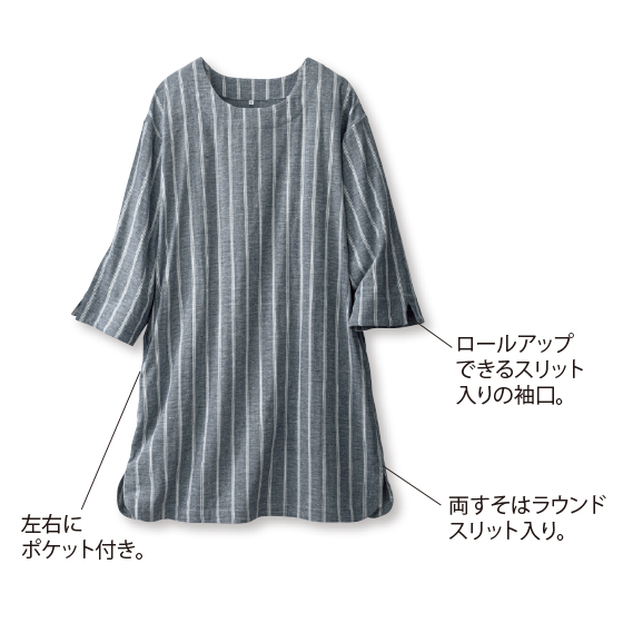 忙しい毎日に頼れるチュニック。ラクに伸びてかぶりやすく、ガーゼが肌に気持ちいい!肌寒い日は中に1枚プラスできるゆったり仕立てで、体形もカバーします。