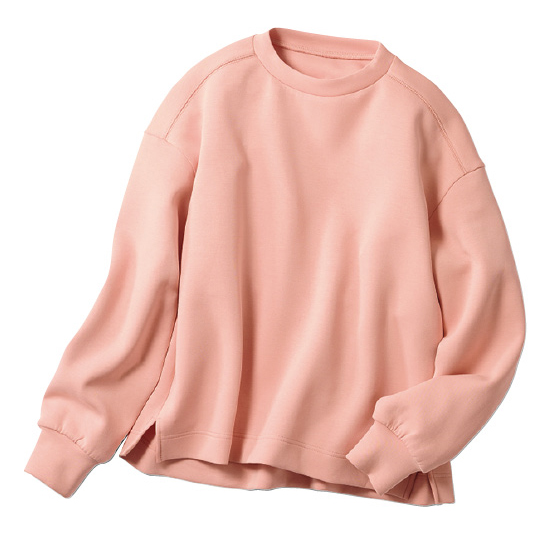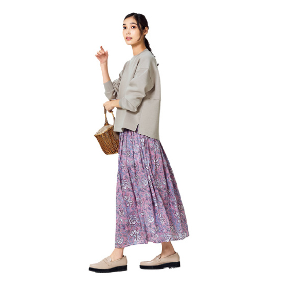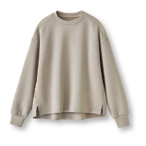 ほどよい厚みのダンボールニット素材。コクーン風シルエットで体形カバーができ、短めの丈感でボトムスも選びません。