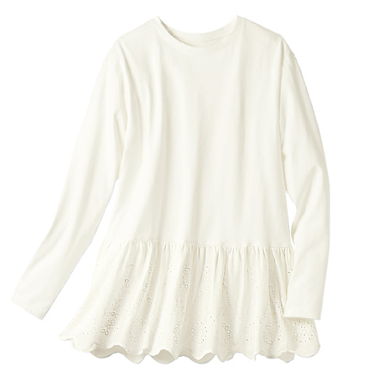 本体部分はカットソー素材、裾はスカラップ刺繍で華やぎをプラス。旬の短丈トップスを重ねれば好バランスに。