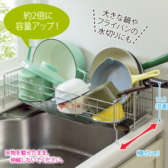 容量が約2倍アップして、大きな鍋やフライパンの水切りにも重宝します。※物を載せたまま、伸縮しないでください。