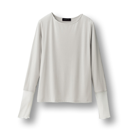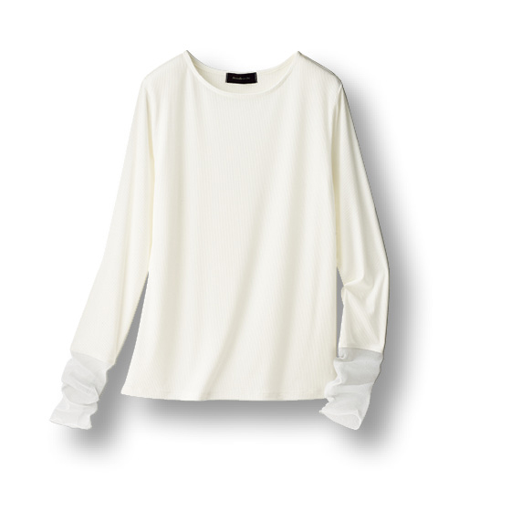 肌に爽やかなテレコ身生地の袖口を、ラメ入りチュールで長めに切替。手元にシアーな抜け感とキラキラ華やぎが出て、今どきコーデに使える1枚。