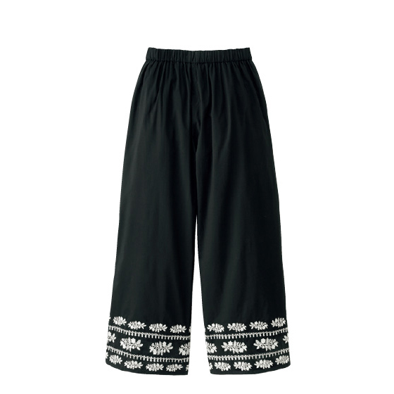 ほんのりエスニックな裾刺繍がアクセントになり、はくだけで夏気分♪ゆったりラクなはき心地で、気になる脚線もカバー。ウエストは3/4ゴムでラクなはき心地。裏地付きで透けにくい。※春夏に着用できます。