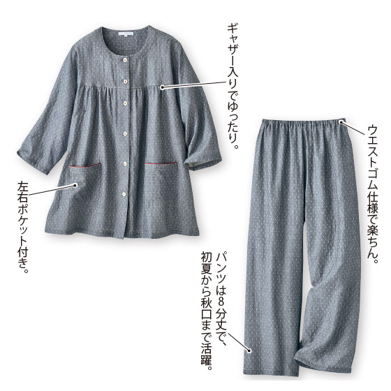 可憐なドット柄を織りで表現。綿100%2重ガーゼパジャマ。
