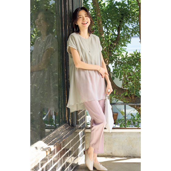 内側はカットソー、外側は長め丈のシフォン。1枚着るだけで涼しげに映えて、体形カバーも叶います。中だけボトムインして、透ける量のアレンジも。