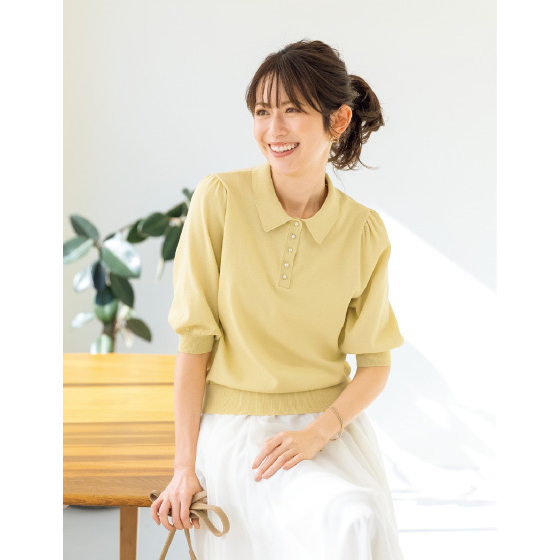 ふっくら袖とパールボタンがやさしいポロ衿ニット。衿付きだからきちんと見えも。
