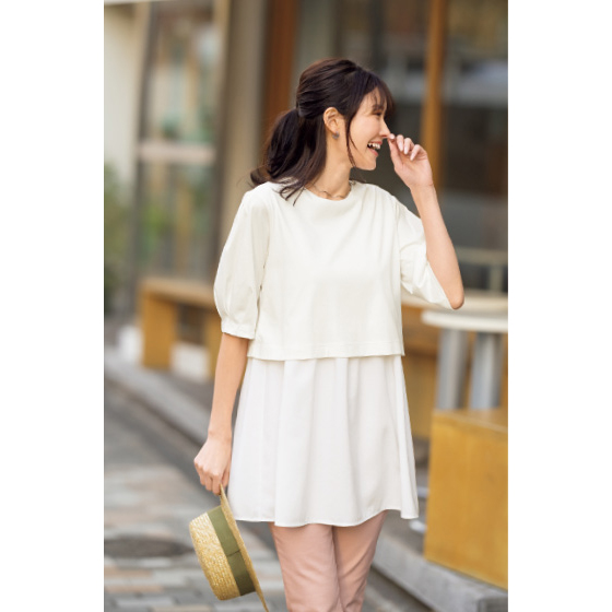 つやが上品な短丈カットソーと、裾がシャツ地切替のロングインナーが肩で合体。2枚重ねの自然なレイヤードが、時短で決まるチュニック。
