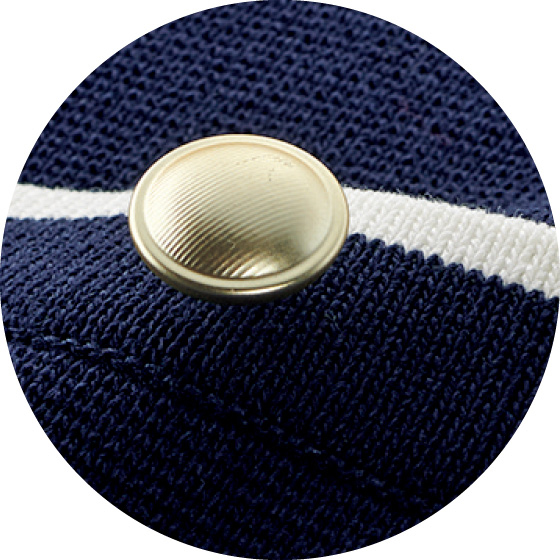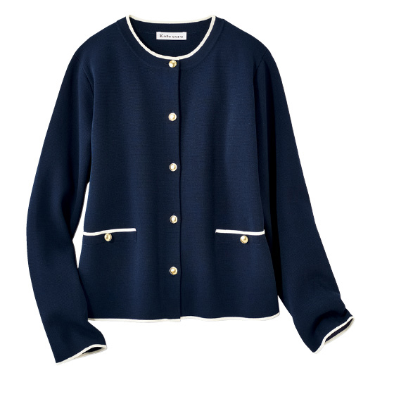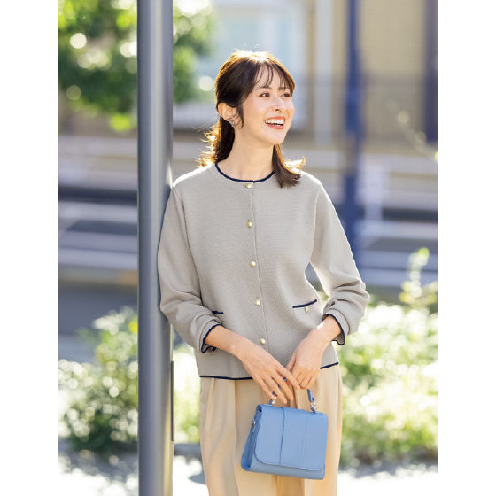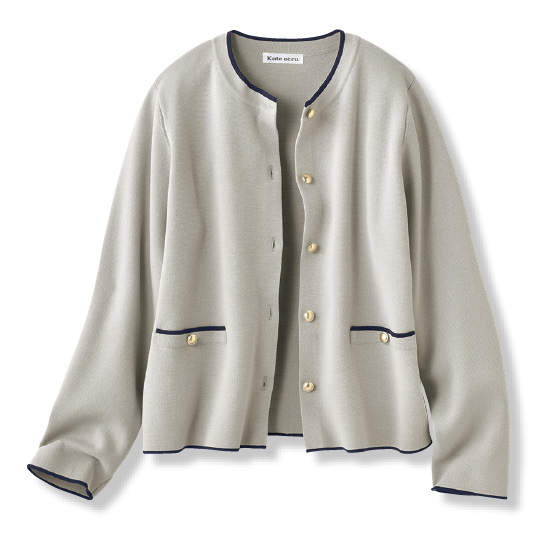 シャリ味がある着心地で、外では日差し避け、中では冷房避けとヘビロテ。きれいな編み地に配色ラインとゴールドボタンを効かせて涼やかに。