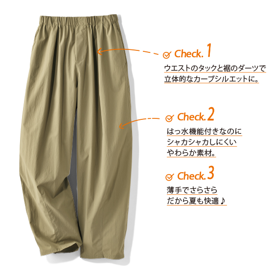 ウエストのタックと裾のダーツで立体的なカーブシルエットに。はっ水機能付きなのにシャカシャカしにくいやわらか素材。薄手でさらさらだから夏も快適!※春夏秋におすすめです。