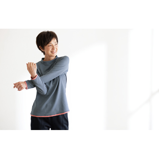 汗をかいても吸汗速乾でサラリ快適。袖口と裾のオシャレな配色で重ね着見え。