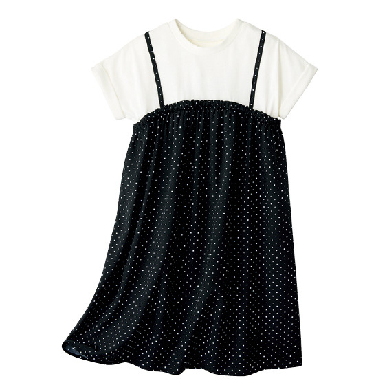●素材:カットソー部分=ポリエステル65%・綿35%(ニット、天竺、吸水速乾加工)、プリント部分=ドット柄/ポリエステル95%・ポリウレタン5%、小花柄/ポリエステル100%(織物、平織)、リブ部分=ポリエステル65%・綿30%・ポリウレタン5%