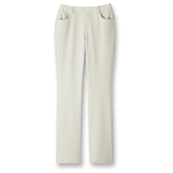 はっ水加工を施し、水をはじいて染み込みにくい素材を使用しています。裾のハネ跡も残りにくく雨の日もおすすめです。グンと伸びて戻るから、ひざがつっぱることもなく快適。ウエスト総ゴムのプルオン仕様で、するっとはけてラク。お出かけに映えるしっかり素材でしわになりにくく、洗濯機でも洗えます。※通年着用できます。