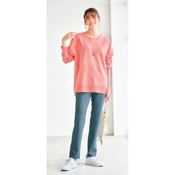 ウエスト総ゴムのプルオン仕様。フェイク前立てでフロントもきれい見え。