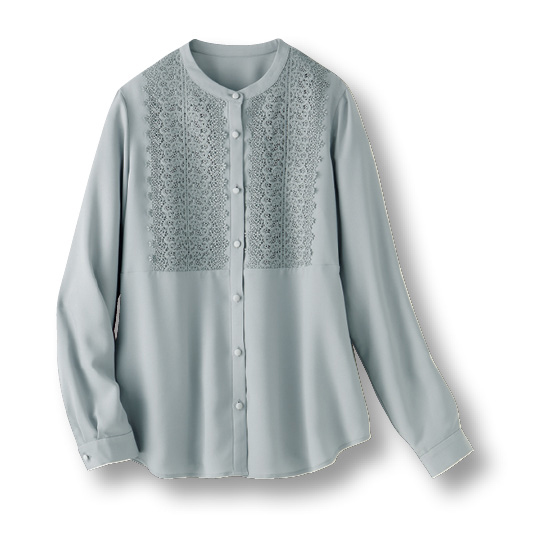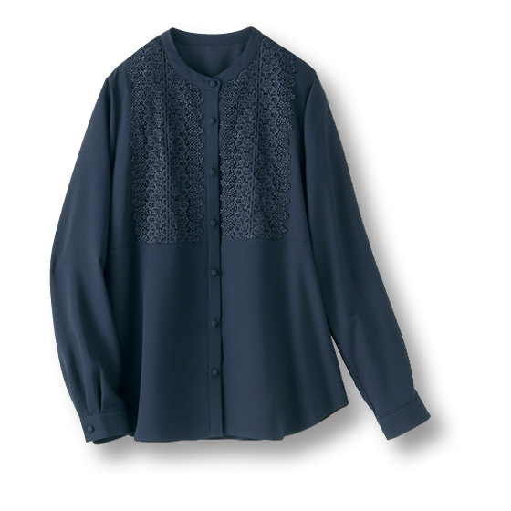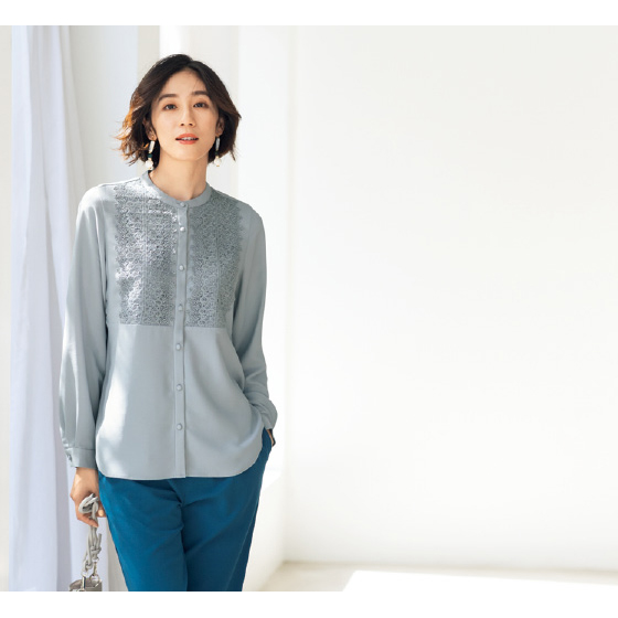 胸元レースとドレープで目を惹くジョーゼットブラウス。後ろダーツやくるみボタンで細部まで上品な仕立てです。たっぷりレースでも甘すぎないのでふだんの外出や仕事にも使えます。肌側はサテン織で、肌当たりがなめらかです。