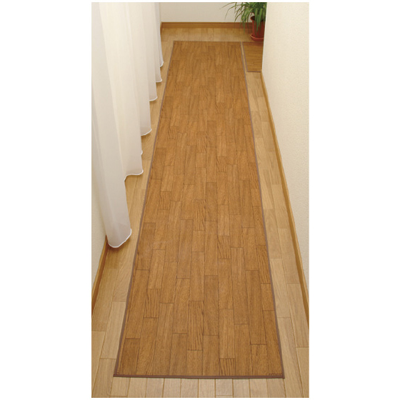 無垢材の床なので、台所の油はね、水はねが気になります。犬がいるので、毛が絡まない素材で拭き掃除しやすいものを選びますが、これは、色調も違和感なく、また、サイズも選べて助かります。飽きないデザインです。