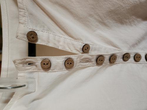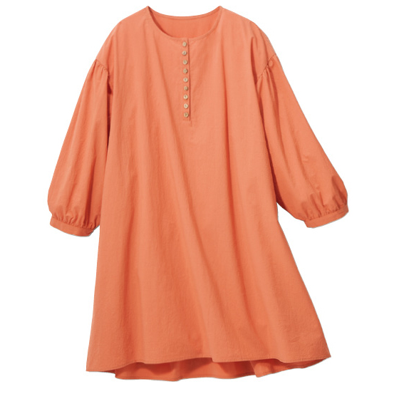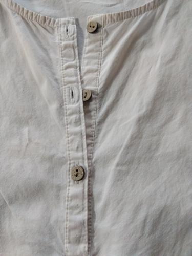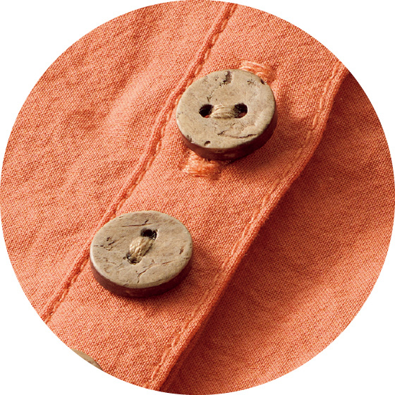 透けすぎないコットン生地を、背中や袖口、少し落ちる肩山にもギャザーを使ってふんわりと。胸元に並ぶ木彫ボタンもナチュラルなチュニックです。後ろ下がりのゆったりシルエットで、気になる腰回りもカバー。
