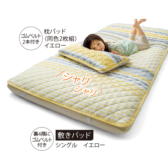 ●裏4隅にズレ防止のゴムベルト付き(敷きパッド)、ゴムベルト2本付き(枕パッド)