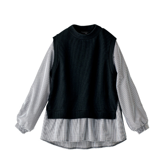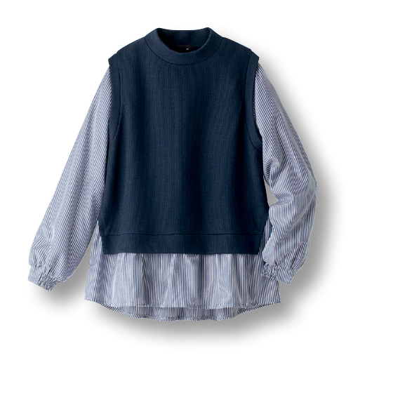 リブベストにシャツの袖と裾が合体。1枚着るだけで旬コーデの完成です。ベストはカットソー素材なので着ごこちラク。