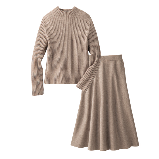 太めのリブが効いたプルオーバーと、ミラノリブ編みAラインスカートのセット。もちもち感のある伸縮ニットで着心地ラクちん。毛玉になりにくく、お手入れも簡単です。※冬に着用できます。