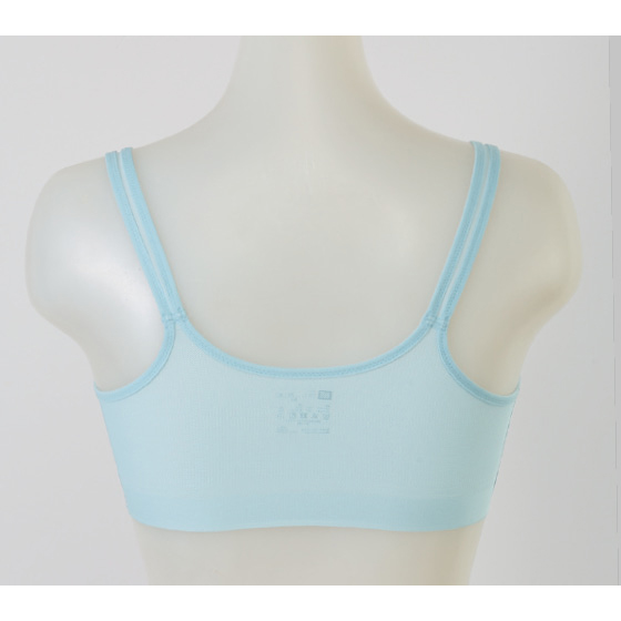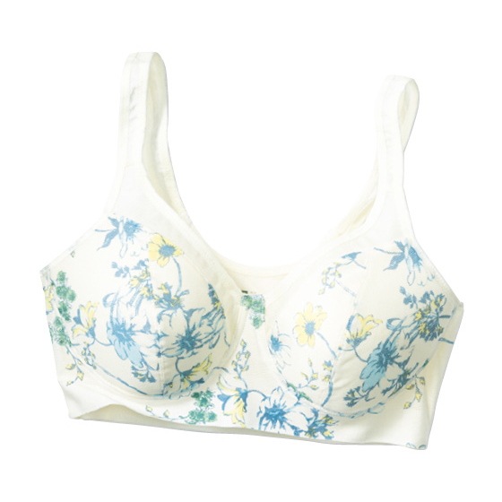 アンダー裏は端テープなしで締めつけ軽減。保形成性カップにノンワイヤ。ホックなしのかぶりタイプ。