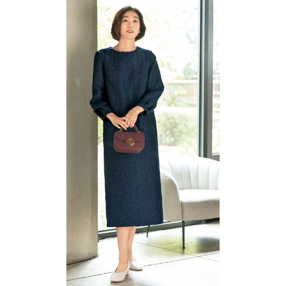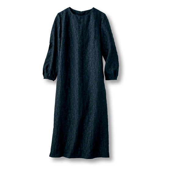 花模様を織り込んだジャカード生地で、上品に華やぐサックワンピース。身頃部分は裏地付きなので1枚で着られます。