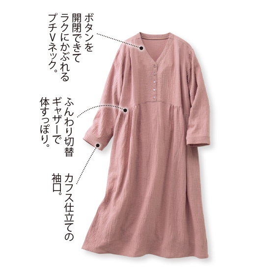 2重ガーゼでふわり、くしゅっとした表面で肌さらり。ゆるりとくつろげるシルエットに仕立てました。