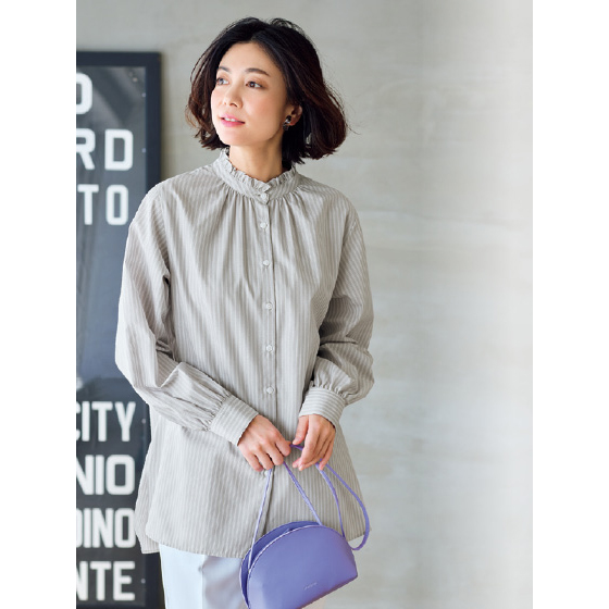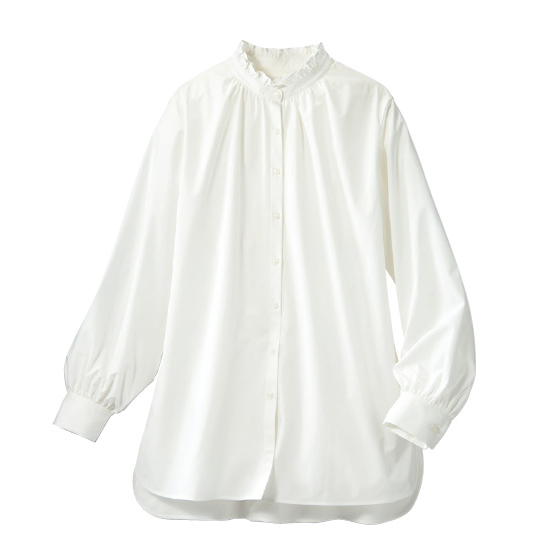 ギャザー仕様でふんわり袖に。ヒップがすっぽり隠れる長め丈。