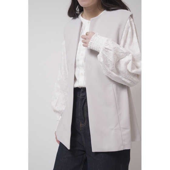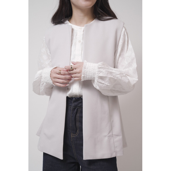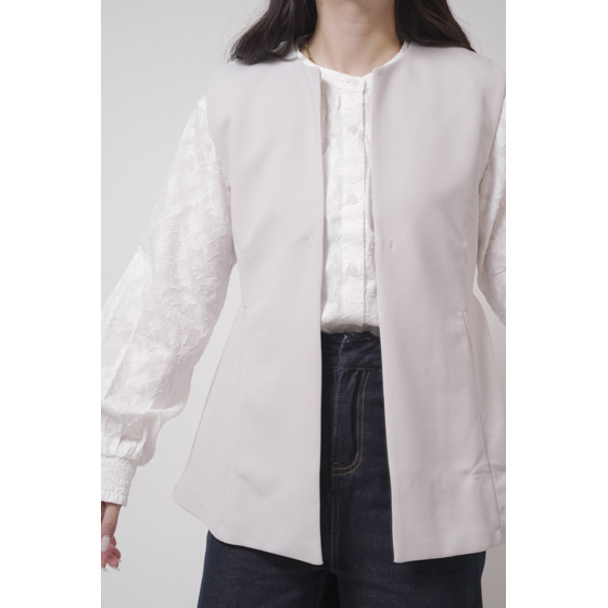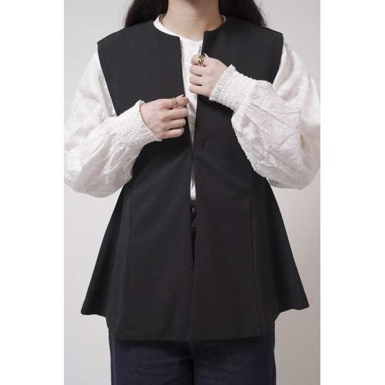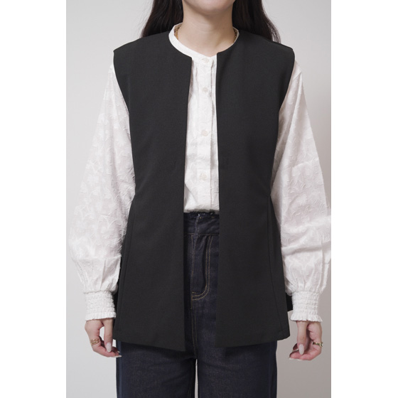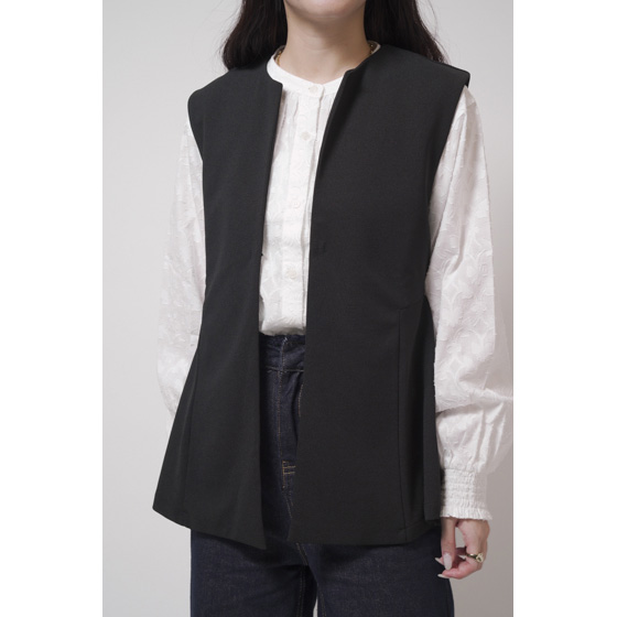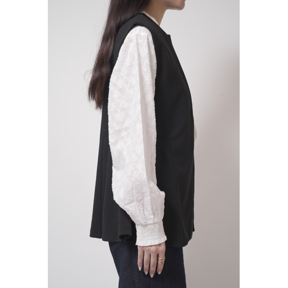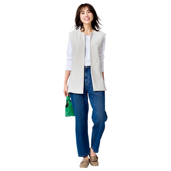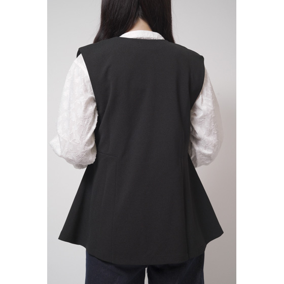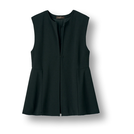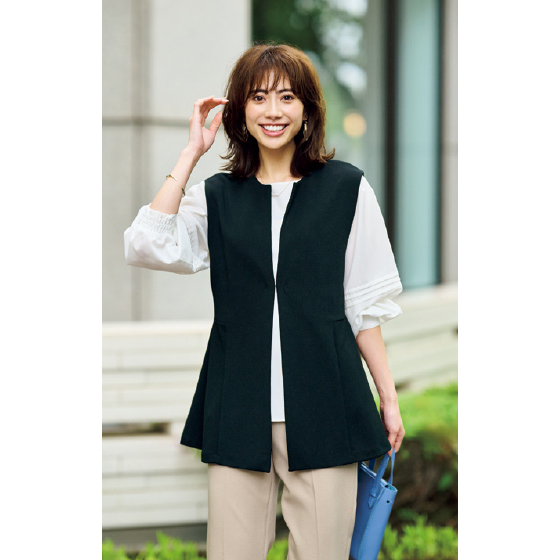 ペプラム切替のフレア感が、上品な印象の華やぎジレ。ジョーゼット風の美カットソーなので、きちんと場面にも着られる映え感です。腰回りをカバーしながら、防シワ素材できれいもキープ。