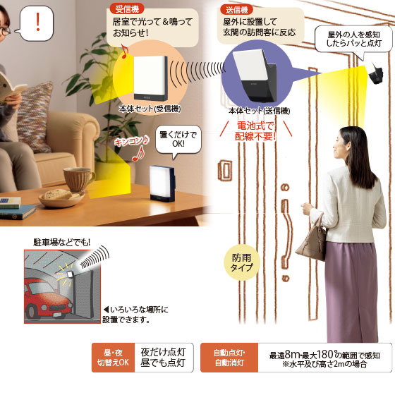 玄関先や庭先などに設置すれば、人感センサーで点灯。不審者を近づけにくくするだけでなく、室内の受信機が光と音で知らせてくれるので、来客に気づきにくいお悩みも解消してくれます。