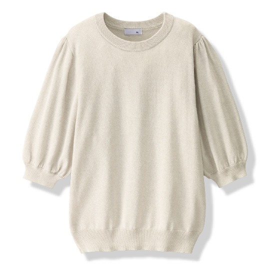 柔らかな中にシャリ味のある夏ニット。ギャザー使いの映え袖が、今見えしながら二の腕カバーも。着回しやすい色味で秋まで活躍。
