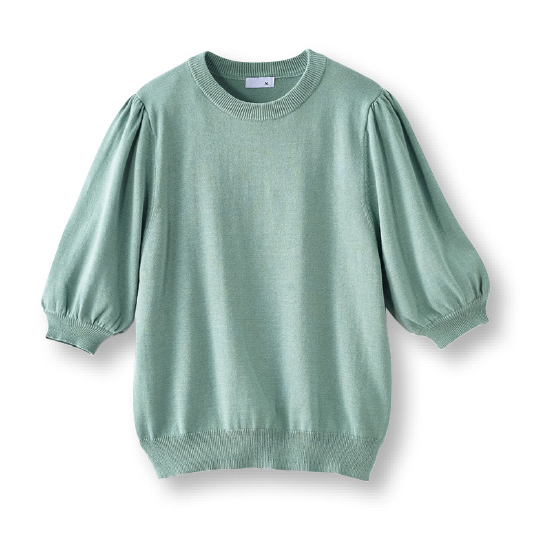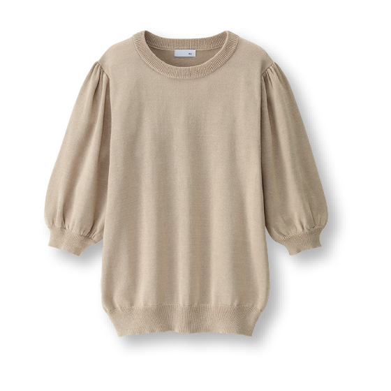 柔らかな中にシャリ味のある夏ニット。ギャザー使いの映え袖が、今見えしながら二の腕カバーも。着回しやすい色味で秋まで活躍。