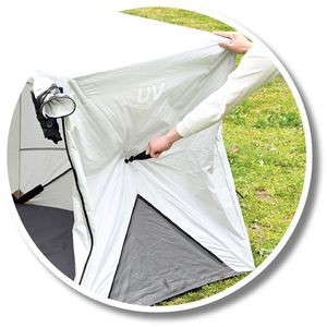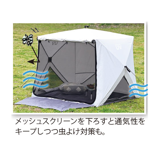 4つの面をそれぞれ傘のように広げたり押したりすれば、設営も撤収もカンタン。フルクローズできるので、着替えやおむつ替えにも重宝します。いざというときの防災用品としても。
