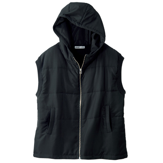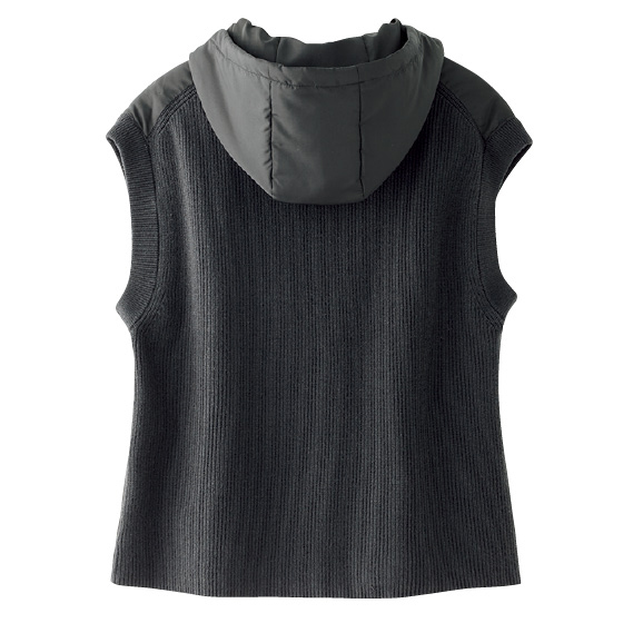 前側は中わた入り、後ろ側はニットの異素材ドッキング。着ぶくれしにくく、インナーしだいで長く着回せます。冬本番はコートの下に着てもOK。