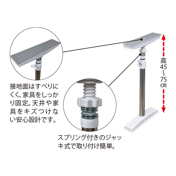 転倒の危険が襲う前に、対策しておきたい防災の基本アイテム。ネジや釘不要で天井や家具に穴などを開けることなく、ジャッキ式なので取り付けも簡単です。