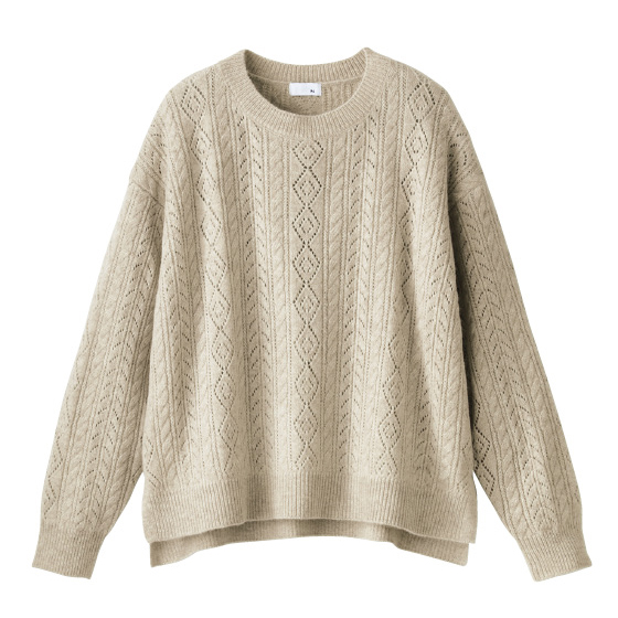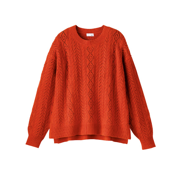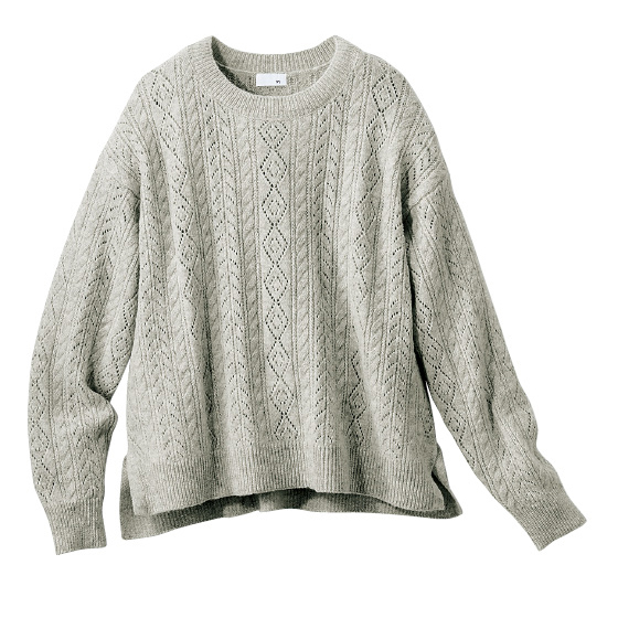 立体感のある透かし編みで、ふんわり華やか。ゆったりシルエットで体形を拾いにくく、裾スリットでさりげなくこなれ感もプラス。