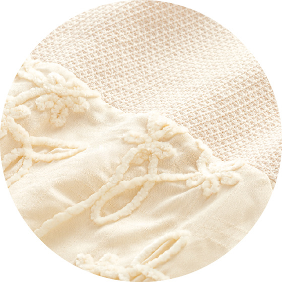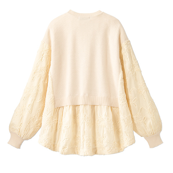 花モチーフの立体感ある刺繍生地とニットがドッキング。ふんわり広がるシルエットで体形カバーをしつつ、レイヤード風の着こなしがこなれた印象に。