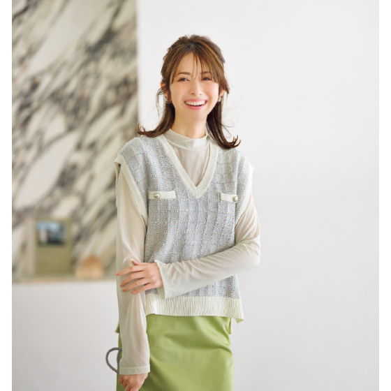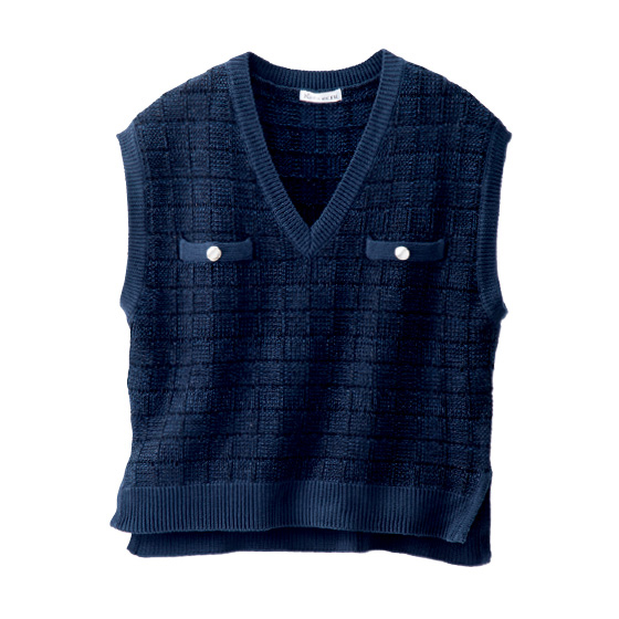 キラキラとラメが輝くチェック柄が、リッチな雰囲気。着ぶくれしにくいサイズ感で、すっきり見えるベストです。サラッと感触で春先から長く活躍。