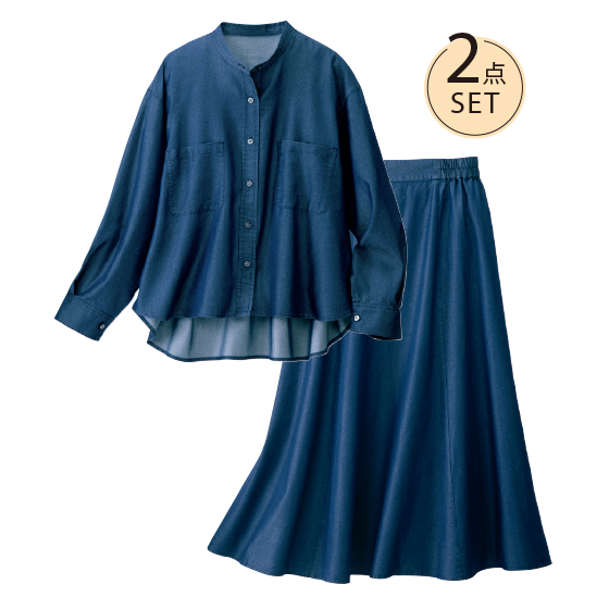 落ち感ですっきり細見えする、シャツ&フレアスカートのセットアップ。上下で着ると上品なワンピ見えし、単品使いでも大人のきれいカジュアルが完成。※春夏秋、3シーズンに着用できます。